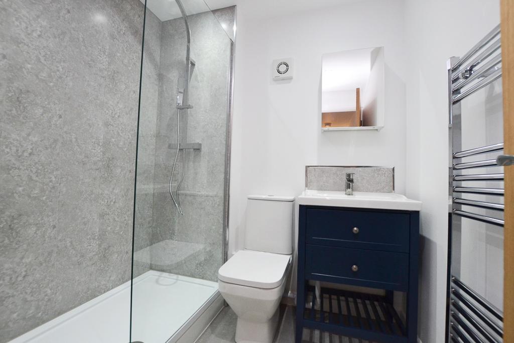 Further benefits include a low-level WC and a chrome heated towel rail, adding both practicality and comfort. The crisp white and grey palette enhances the sense of light and space, resulting in a fresh and sophisticated finish.